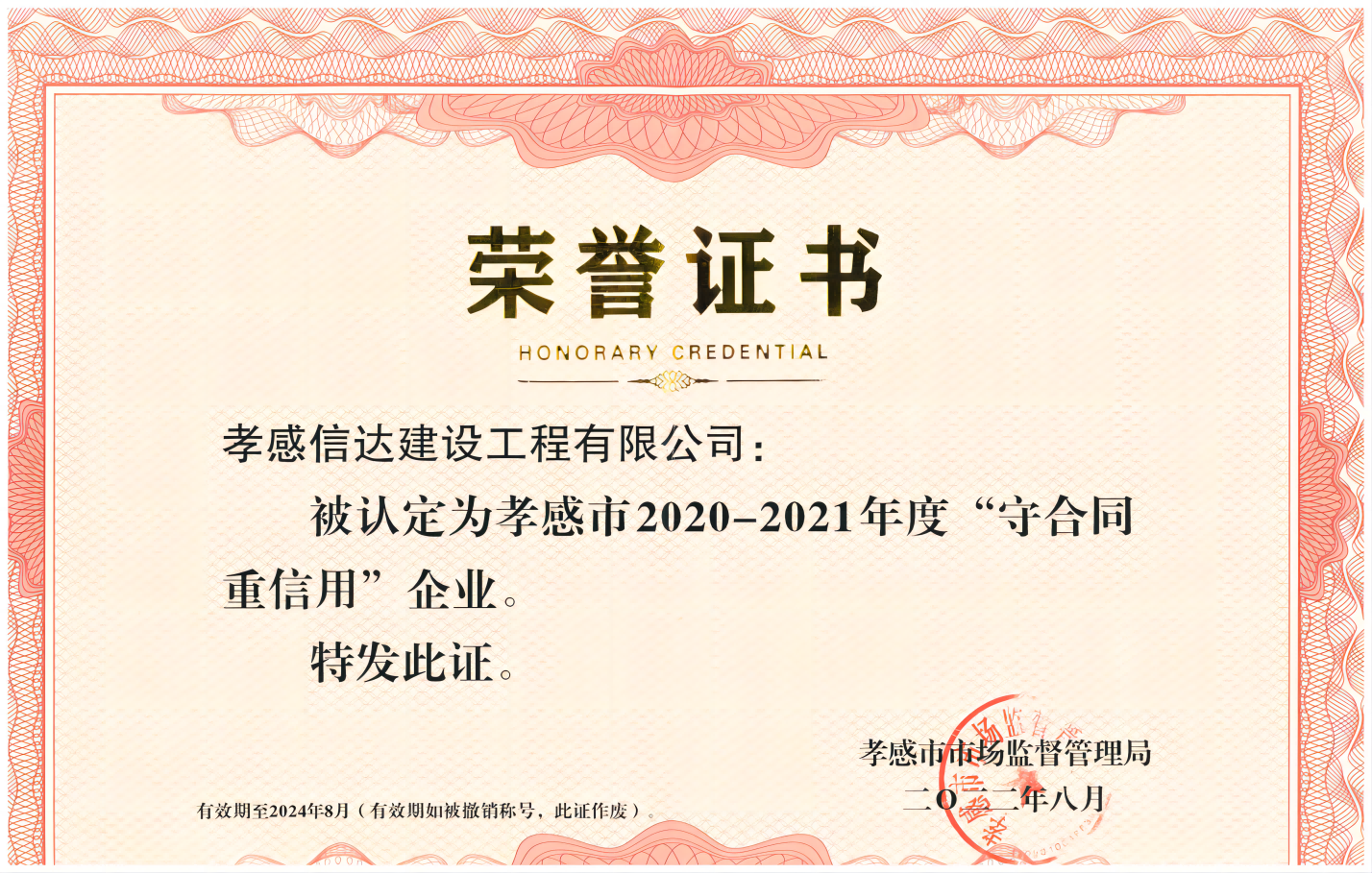 孝感市2022-2023年度守合同重信用企業(yè)榮譽(yù)證書(shū)...祝賀孝感信達(dá)建設(shè)工程有限公司榮獲孝感市市場(chǎng)監(jiān)督管理局頒布的“孝感市2022-2023年度守合同重信用企業(yè)”榮譽(yù)證書(shū)......